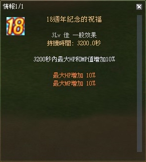 ※注意:一個帳號只有一個等級20以上的角色可以獲得十八週年記念勳章效果。