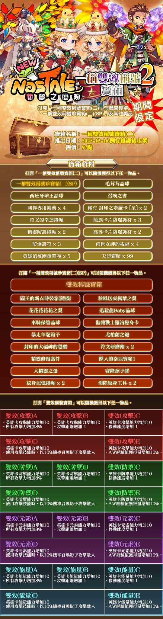 購買售價97點的「一稱雙效稱號寶箱(二)」可以獲得「一稱雙效稱號寶箱(二)x1」。