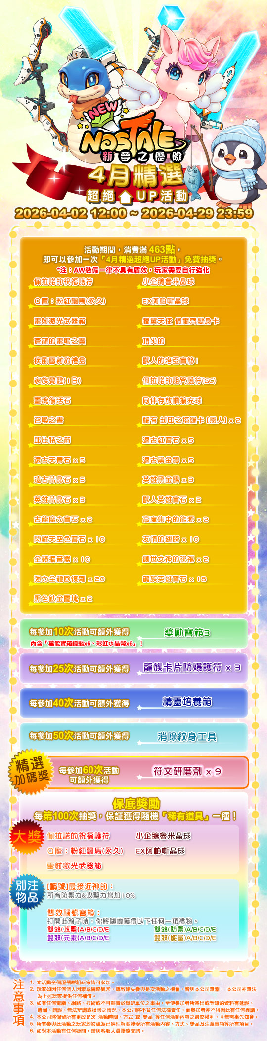 「活動期間,消費滿 463點,即可以參加一次「4月精選超絕UP活動!」免費抽獎。」各品項機率